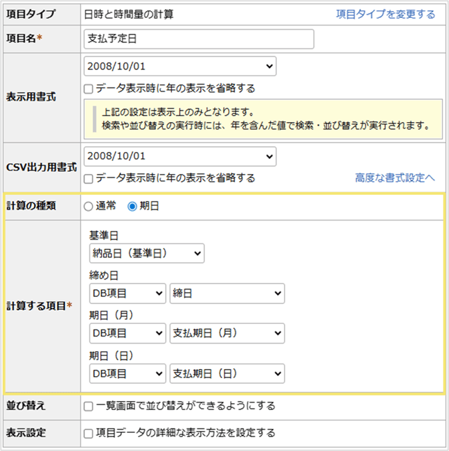 項目設定:項目タイプ「日時と時間量の計算」「日時と日時の計算」